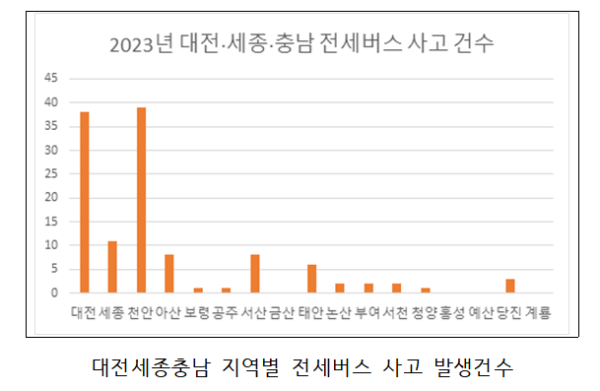 대전.세종.충남지역에서는 충남 천안시가 2023년에 39건의 전세버스 교통사고가 발생해 발생건수가 가장 많았고, 이어 대전 38건, 세종 11건, 아산, 태안 8건, 태안 6건 등의 순이었다.