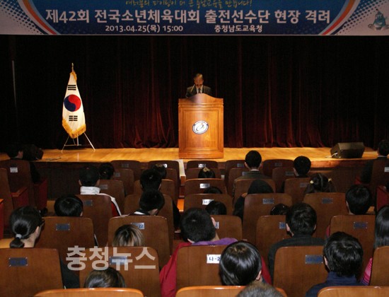 충청남도교육청 교육감 권한대행 전찬환 부교육감은 25일 천안교육지원청 대강당에서 충청남도의회 교육위원회 김지철, 이진환 의원, 천안교육지원청 류광선 교육장, 전국소년체전 천안지역 출전선수 소속 학교장과 지도교사, 지도코치 등 165명이 참석한 가운데 제42회 전국소년체육대회에 출전하는 선수를 격려하고 건강관리와 컨디션 유지를 당부했다.