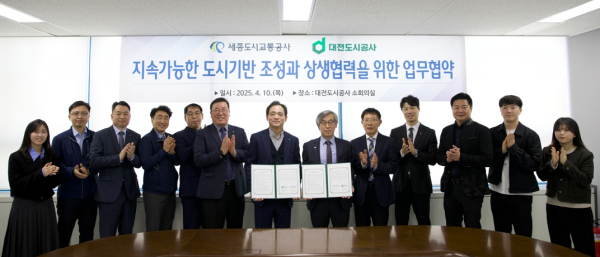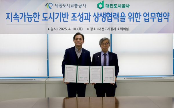 [충청뉴스 최형순 기자] 세종도시교통공사(사장 도순구)는 10일 대전도시공사(사장 정국영)와 대전도시공사 본사에서 ‘지속가능한 도시 기반 조성과 지역 간 상생 협력’을 위한 업무협약(MOU)을 체결했다.