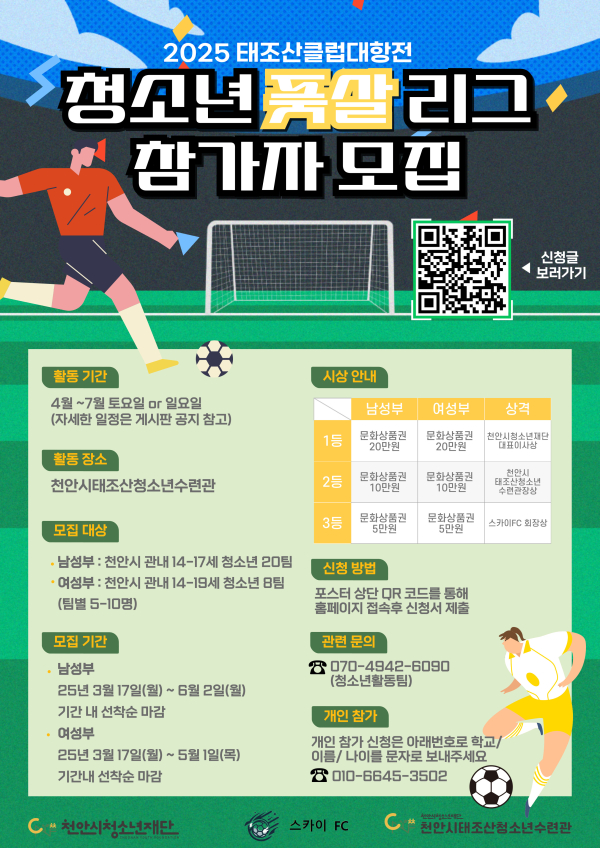 [충청뉴스 박동혁 기자] 충남 천안시태조산청소년수련관은 ‘2025 태조산클럽대항전’풋살대회 참가팀을 모집한다고 12일 밝혔다.