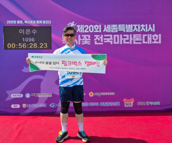 [충청뉴스 최형순 기자] 초록우산 세종지역본부(본부장 박미애)는 14일, 이은수 세종시 교육지원과장이 '달리고 기부하고 시즌3'의 일환으로 제20회 복사꽃 전국마라톤 대회 10km 코스를 56분 28초로 완주하고, "세종지역 저소득가정 여성 청소년 지원을 위한 후원금 50만원을 전달했다"고 밝혔다.