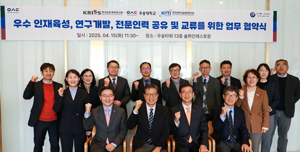 한편 이날 협약식에는 KRISS 이호성 원장, KISTI 이식 원장을 비롯한 양 기관의 주요 관계자들과 우송대 오덕성 총장, 진고환 부총장, 정병현 산학협력단장, 류태창 기획혁신본부장 등 20여 명이 참석했다.
