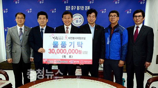 2일 대전봉사체험교실(회장 권홍주)은 중구청을 방문해 어려운 이웃에 전달해 달라며 3천만원 상당의 돼지고기 갈매기살 2,000kg을 기탁했다.