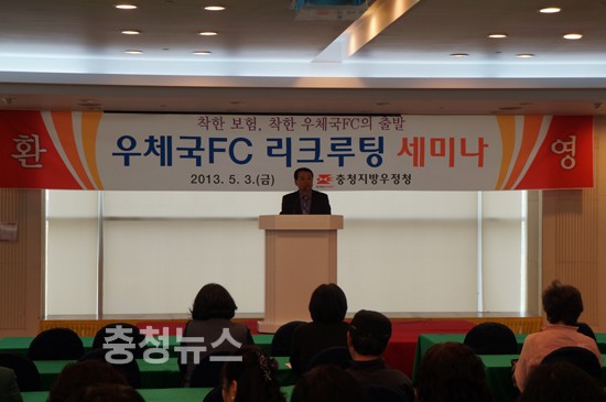 충청지방우정청(청장 이재홍)은 3일 오후 오페라웨딩홀(대전 서구 둔산동)에서 우체국FC에 관심있는 일반인 100여명을 대상으로 FC모집을 위한 리크루팅 세미나를 개최했다고 밝혔다.