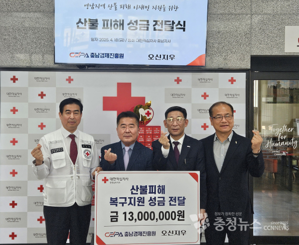[충청뉴스 박영환 기자] 충남경제진흥원(이하 진흥원) CEO 모임인 오신지우(五信知友)는 영남지역 산불피해 이재민을 위한 성금 1,026만원을 기부했다고 밝혔다.