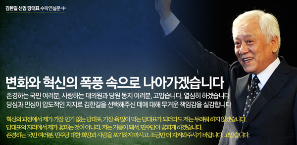 김 대표는 혁신의 과정에서 제가 가장 인기 없는 당대표, 가장 욕 많이 먹는 당대표가 되더라도 저는 두려워 하지 않겠다. 당대표의 자리에서 제가 꽃피는 것이 아니라, 저는 거름이 돼서, 민주당이 꽃피게 하겠다.