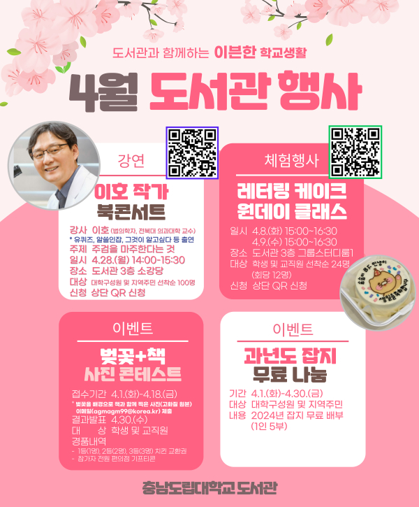 4월 ‘벚꽃+책 사진 콘테스트’에도 많은 학생과 교직원들이 참여해 책과 봄을 함께 담은 감성 가득한 작품들을 선보였으며 투표를 통해 수상작이 선정될 예정이며, 참가자 전원에게 기념품이 제공된다.