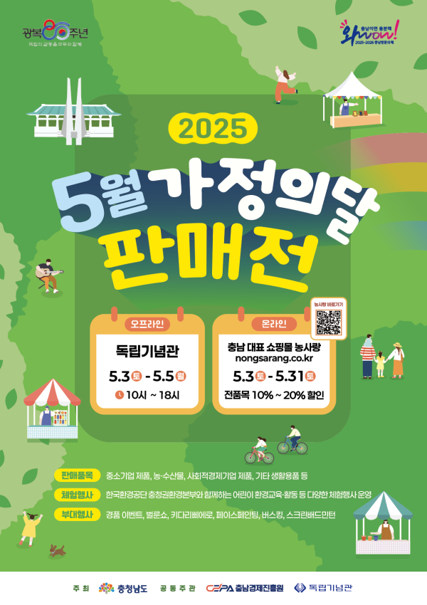 오프라인 행사는 5월 3일부터 5월 5일까지 독립기념관에서 3일간 열리고 온라인 할인 행사는 5월 3일부터 5월 31일까지 한 달간 ‘농사랑’ 쇼핑몰을 통해 전품목에 10~20%의 할인 혜택이 제공된다.