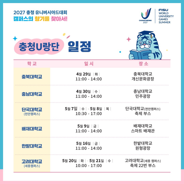 첫 시작으로 29일 충북대학교를 방문한 ‘충청 U랑단’은 상반기(4~5월) 동안 국제대학스포츠연맹(FISU) 헬시캠퍼스 인증을 추진 중인 충청권 6개 대학을 우선적으로 찾아간다.