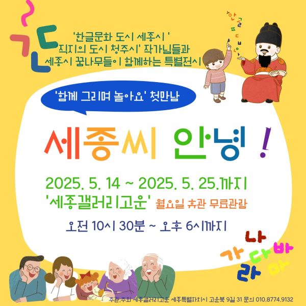 [충청뉴스 최형순 기자] 세종갤러리고운(관장 유보경)은 5월 가정의 달을 맞이하여 5월 14일(수)부터 5월 25일(일)까지 특별 기획전시 '세종씨 안녕! 함께 그리며 놀아요'를 개최한다.