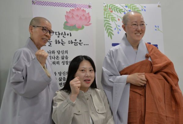 좌로부터 은사 스님, 김지혜 회장, 주지 선중 스님