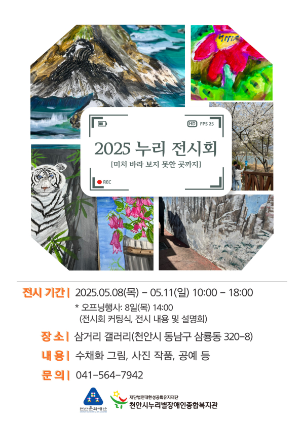 [충청뉴스 최형순 기자] 천안시누리별장애인종합복지관(관장 김경준)은 오는 8일 ~ 11일까지 오전 10시부터 오후 6시까지 천안시 삼거리갤러리에서 특별한 예술 전시회, ‘2025 누리전시회’를 개최한다.