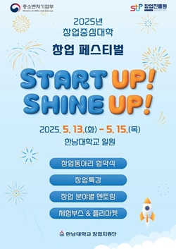 한남대는 오는 13일부터 사흘간 한남대 린튼공원 및 창업존 일대에서 ‘2025년 창업중심대학 스타트업 Meet-Up Day 창업페스티벌’을 개최한다고 9일 밝혔다.