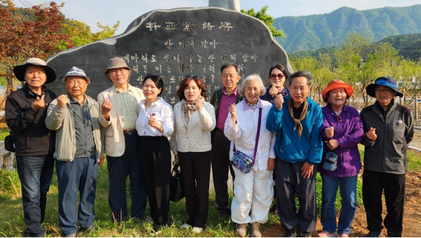 특히, 박정만 시인의 시비가 있는 이곳에서 시 ‘산아래 앉아’의 한 구절인 “메아리도 살지 않은 산아래 앉아 그리운 이름 하나 불러봅니다~"라고 시인의 삶과 문학 정신을 기리는 뜻깊은 시간을 가졌다.