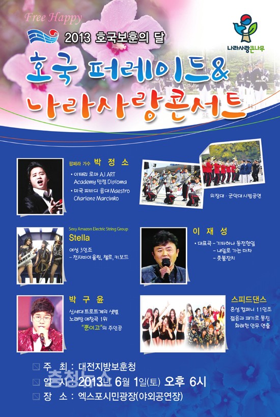 대전지방보훈청은 6월 호국보훈의 달을 맞아 나라를 위해 희생한 호국영령의 위훈을 기리고 국가유공자의 헌신과 공헌에 대해 시민과 학생 등이 함께 하는 나눔과 감사의 나라사랑 콘서트를 내달 1일 대전 엑스포시민광장 야외무대에서 갖는다고 밝혔다.