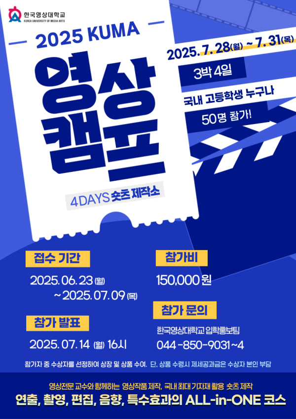 지난해 KUMA영상캠프에 참여한 학생이 전한 말이다. 한국영상대학교는 올해도 방송영상미디어 인재 발굴을 위해 ‘2025 KUMA영상캠프’에 참여할 교육생을 7월 9일까지 모집한다. 단 4일, 영상의 세계를 처음 접하는 학생도 자신만의 콘텐츠를 완성할 수 있도록 기획된 특별한 여름학교다.