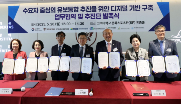 [충청뉴스 최형순 기자] 고려대학교 세종캠퍼스(부총장 김영)는 오늘 오후 1시, 세종캠퍼스 문화스포츠관 유중홀에서 교육부, 한국교육학술정보원, 한국사회보장정보원, 한국보육진흥원, 어린이집안전공제회, 한국교원대학교 유아교육연구소와 함께 수요자 중심 유보통합 추진을 위한 디지털 기반 구축 업무협약을 체결하고 추진단 발대식을 개최했다.