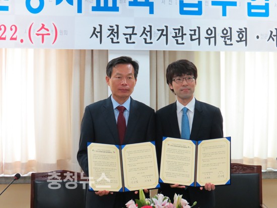 서천군선거관리위원회(위원장 이종문)와 서천군청(군수 나소열)은 22일 서천군청 상황실에서 민주시민정치교육의 선도적 역할 수행을 통한 선진 정치환경 구현을 위해 “서천군선관위-서천군청간 업무협약(MOU)”을 체결했다고 밝혔다.