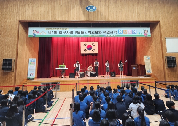 ‘친구야, 우리 같이 공연 보러 갈래?’라는 주제로 진행된 이번 공연은 책임규약 선서, 친구사랑 3운동 소개, 보컬부·밴드부 무대, 학교폭력 담당 교사의 특별공연으로 구성됐다. 학생들은 음악을 통해 존중과 배려의 메시지를 자연스럽게 전달했다.