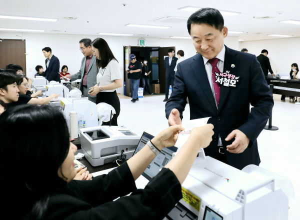 서철모 서구청장이 29일 서구청 지하1층 다목적실에 마련된 제21대 대통령선거 사전투표소에서 투표하고 있다
