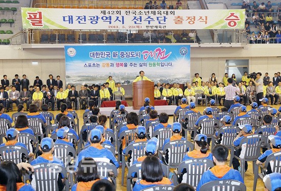 시는 23일 오전 한밭체육관에서 염홍철 대전시장, 곽영교 시의회의장, 김신호 교육감, 선수단 등 400여명이 참석한 가운데 전국소년체육대회 필승을 다짐하는 출정식을 가졌다.