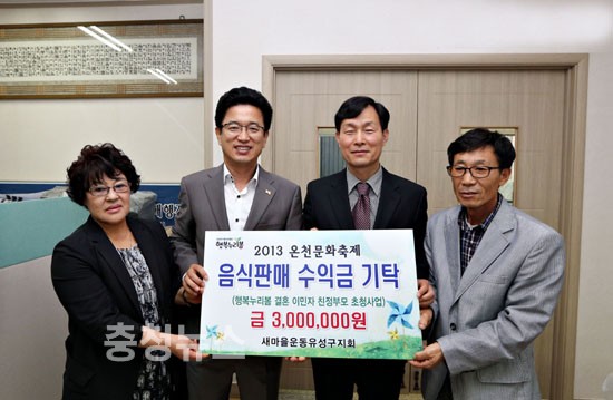 대전시 유성구(구청장 허태정)가 27일 오후 유성커뮤니티센터에서 열린 기탁식을 통해 새마을회운동 유성구지회(회장 이정호)로부터 새마을회가 유성온천문화축제에서 음식부스를 운영해 거둔 수익금 300만원을 사회복지공동모금회를 통해 ‘행복누리봄’ 결혼이민자 친정부모 초청사업에 지정 기탁받았다.