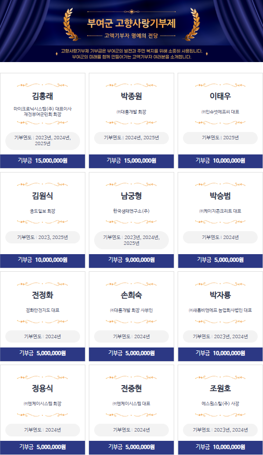 이번에 신설되는 ‘고향사랑 명예의 전당’은 2023년부터 2025년까지 500만 원 이상을 기부한 고액 기부자를 대상으로 한다. 부여군청 누리집의 군정소식>고향사랑기부제>고향사랑 명예의 전당에 기부자 명단을 게시하고 있다.