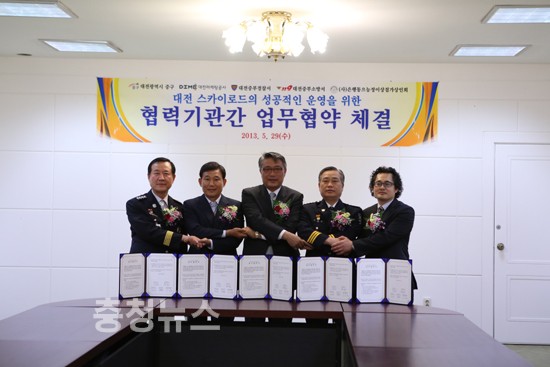 대전마케팅공사와 중구·중부경찰서·중부소방서·은행동으능정이상점가상인회와 4개 기관은 ‘대전 스카이로드 성공적인 운영을 위한 협약’을 29일 오전 (구)충남도청 2층 소회의실에서 체결했다.
