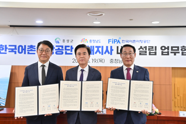 [충청뉴스 박영환 기자] 충남도는 19일 도청 상황실에서 김태흠 지사, 홍종욱 어촌어항공단 이사장, 이용록 홍성군수와 ‘한국어촌어항공단 서해지사 내포 설립을 위한 업무협약’을 체결했다고 밝혔다.