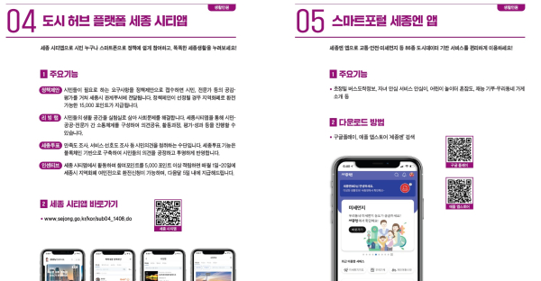 특히, 세종살이에 필수적인 정보들을 집중적으로 수록했다. 예를 들어, 관내 체육시설 통합예약시스템 활용 방법, 세종시 대중교통 월 정액권 '이응패스' 가입 방법, 세종시 지역화폐 '여민전' 이용 방법 등 실생활에 바로 적용할 수 있는 핵심 정보들을 상세하게 안내한다.