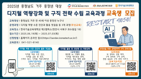 [충청뉴스 최형순 기자] 한국기술교육대학교 산학협력단(단장 이규만)은 충청남도 지역 중장년층의 성공적인 재취업 및 경력 설계를 지원하기 위한 ‘RESTART 4050’ 프로그램 교육생 20명을 7월 3일(목)까지 선착순으로 모집한다.
