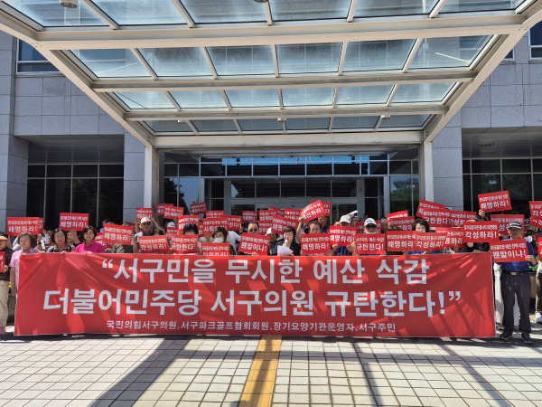 국민의힘 서구의원들은 23일 오전 서구 파크골프협회 회원, 장기요양기관 운영자, 서구 주민 등 80여 명과 대전시의회 앞에서 회견을 갖고 "이는 단순한 예산 조정이 아니라 서구민을 무시하고, 현장을 외면하며, 주민의 삶을 정치의 제물로 삼은 폭거"라며 이같이 비판했다.