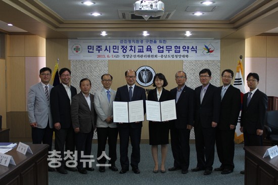 충남도립청양대학(총장구본충)은 7일 청양군선거관리위원회와 업무협약을 체결하고 재학생들의 민주 시민의식 고취를 위해 상호협력 해나가기로 했다.