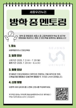 [충청뉴스 최형순 기자] 대학생 봉사 멘토단 세종우리누리는 7월 23일부터 8월 6일까지 세종시 관내 중고등학생을 대상으로 ‘여름방학 중 진로·진학 멘토링’을 세종시교육청진로교육원에서 대면으로 운영한다.