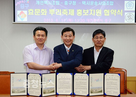 대전시 중구(구청장 박용갑)가 11일 구청 중회의실에서 오는 10월 11일부터 뿌리공원 일원에서 개최되는 제5회 대전효문화 뿌리축제의 성공적인 개최를 위해 개인택시조합 및 택시운송사업조합과 홍보 지원 협약을 체결했다.