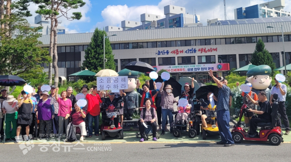 [충청뉴스 논산 = 조홍기 기자] 논산시청 인근 아파트 주민들이 장기간 이어진 시위 방송차량의 소음 피해를 호소하며 집단 행동에 나섰다. 논산 개나리아파트, 아주아파트 주민 50여 명은 30일 오전 논산시청 앞에서 시위 방송 차량을 향해 항의 방문을 진행했다.