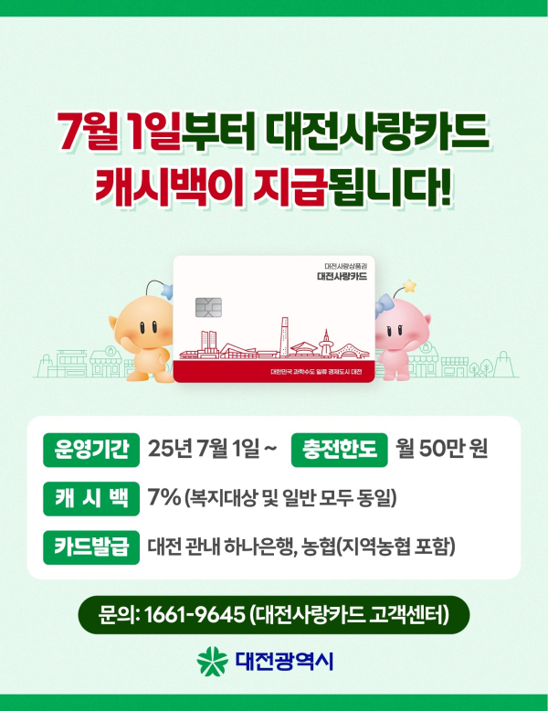 대전사랑카드는 월 구매한도를 기존 30만원보다 상향된 50만 원으로 책정됐다. 사용 금액의 7%를 캐시백으로 제공되며, 전액 사용 시 최대 3만 5,000원의 혜택을 받을 수 있게 된다.