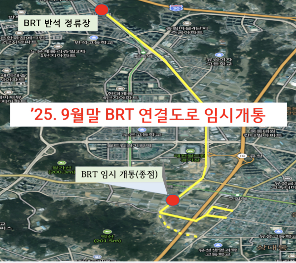 [충청뉴스 김용우 기자] 대전 유성구 외삼네거리와 유성복합터미널을 연결하는 6.6㎞ 구간 BRT(간선급행버스) 도로가 오는 2030년 개통된다. 최근 정치권에서 책임 공방을 벌이고 있는 반석역~장대교차로 구간은 9월 임시 개통된다.