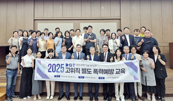 [충청뉴스 이성현 기자] 대전과학기술대학교 인권센터는 총장, 부총장, 학과장 등 고위직 교원을 대상으로 성희롱·성매매·성폭력·가정폭력 예방 및 방지를 위한 고위직 별도 폭력예방 교육을 실시했다고 4일 밝혔다.