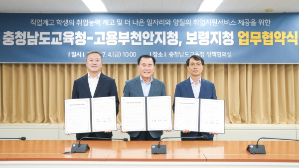 [충청뉴스 유규상 기자] 고용노동부 천안지청(지청장 최종수)과 보령지청(지청장 이점석)은 4일 충청남도교육청(교육감 김지철)과 함께 충남지역 직업계고 학생들의 취업역량 제고 및 고졸 청년을 위한 양질의 일자리 제공을 위한 업무협약을 체결했다.