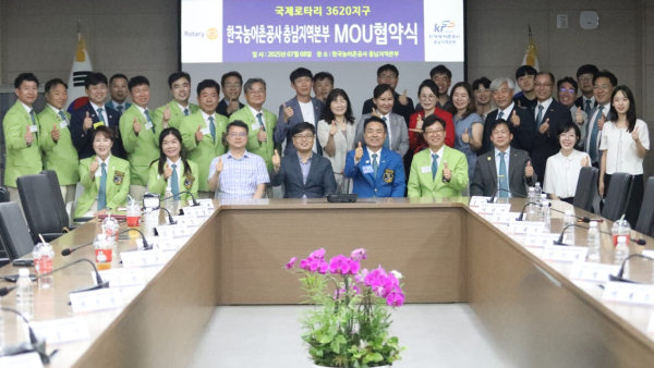 [충청뉴스 최형순 기자] 한국농어촌공사 충남지역본부는 7월 8일 국제로타리 3620지구와 충남지역의 깨끗하고 지속 가능한 내일을 위한 친환경 프로젝트 확대를 목표로 업무협약(MOU)을 체결했다.