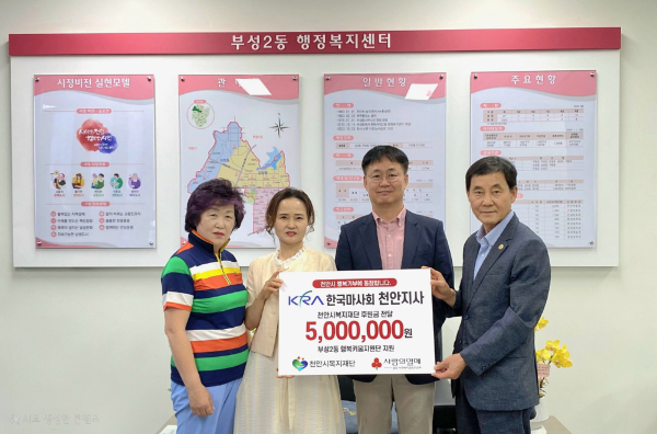 [충청뉴스 유규상 기자] 한국마사회 천안지사(지사장 정태인)는 10일 천안시 부성2동(동장 장현숙)에 후원금 500만 원을 기탁했다.