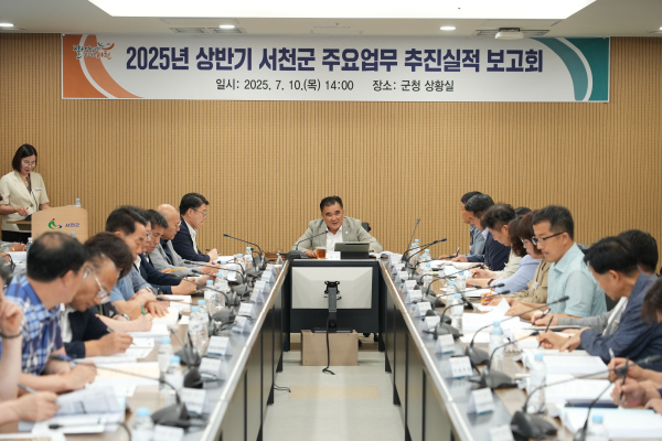 [충청뉴스 서천 = 조홍기 기자] 서천군은 10일 군청 상황실에서 김기웅 군수를 비롯한 부군수, 국·소장, 부서장 등 70여 명이 참석한 가운데 2025년 상반기 주요업무 추진실적 보고회를 개최했다.