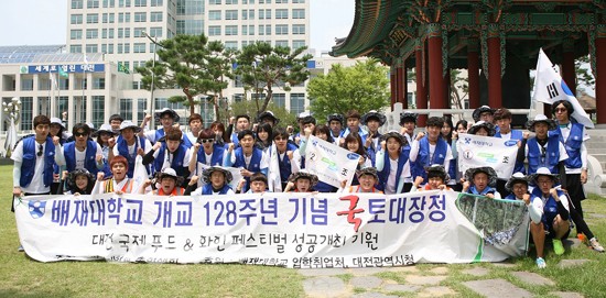 배재대학교는 24일 대전시청 남문광장에서 개교 128주년 기념 국토대장정 출정식을 갖고 300여km를 횡단하는 9박 10일 대장정에 돌입했다.