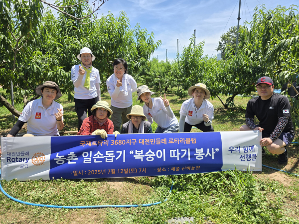 [충청뉴스 박영환 기자] 국제로타리 3680지구 2지역 대전민들레클럽은 세종시 연서면 와촌리에 위치한 산하농원을 찾아 복숭아 수확 작업과 주변 환경 정리 등으로 부족한 일손을 보태며 구슬땀을 흘렸다고 13일 밝혔다.