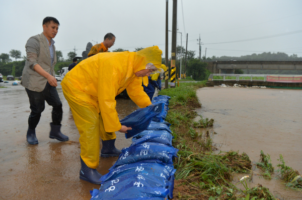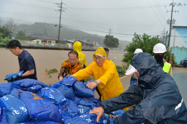 이용록 홍성군수가 17일, 갈산교 범람으로 침수 피해를 입은 갈산전통시장 일원에서 주민, 직원들과 함께 모래주머니를 활용한 긴급 복구 작업에 나섰다.