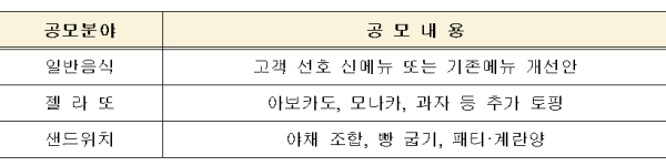 일반메뉴 공모전은 고객이 선호하는 새로운 레시피 또는 기존메뉴에 대한 개선의견 등을 공모한다. 젤라또와 샌드위치는 기존 메뉴에 새롭게 추가할 수 있는 고객만의 시크릿 토핑조합을 공모할 예정이다.