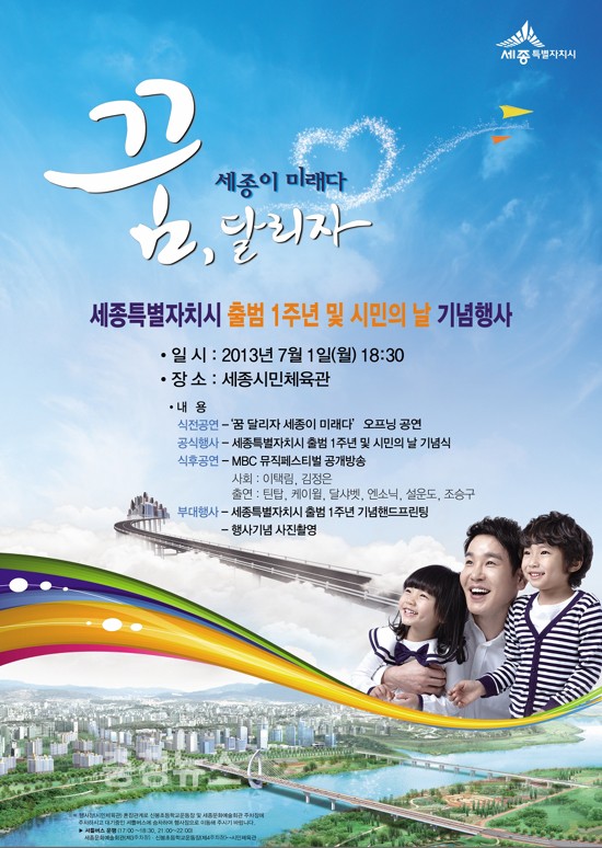 세종특별자치시(이하 세종시, 시장 유한식)가 ‘출범 1주년’ 및 ‘제1회 시민의 날’을 맞아 내달 1일 오후 세종시민체육관에서 기념행사를 개최한다.