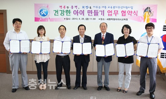 세종특별자치시교육청(교육감 신정균)은 28일 본청 교육감실에서 충청대학교(총장 유선규)와 관내 6개 안경업체(시호비전, 다비치안경원, 그린안경원, 서독안경원, 불란서안경원, 천보당)가 함께하는 '건강한 아이 만들기' 업무 협약을 체결했다.