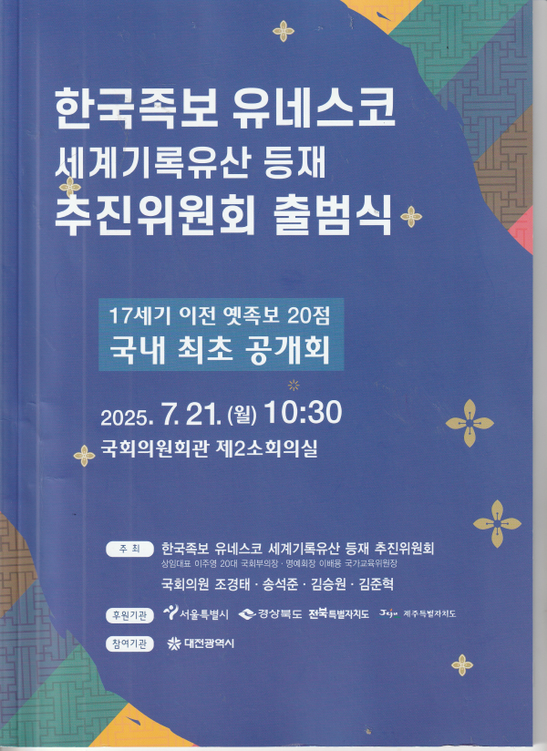 [충청뉴스 유규상 기자]  한국 족보 유네스코 세계기록유산 등재 추진위원회가 21일 오전 발족했다. 위원회는 이날 국회의원회관 제2소회의실에서 역사학계와 문화계, 종중 관계자, 정치인 등 300여 명이 참석한 가운데 발대식을 가졌다.